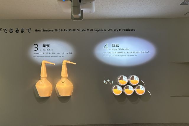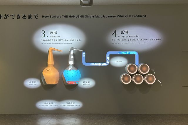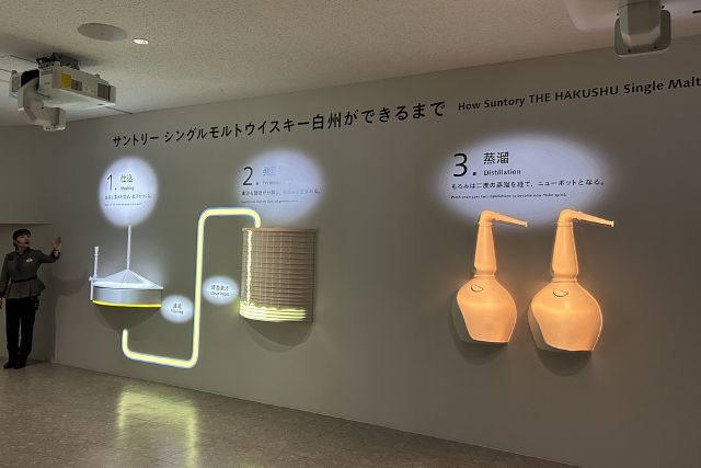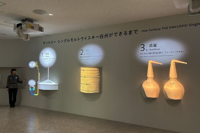 実物を見る前に、プロジェクションマッピングで先ほどよりも「白州」について深掘りした内容の「原料や製造の流れ」を学びます。