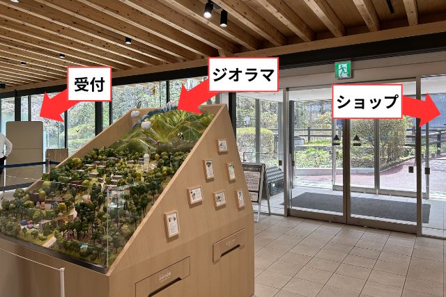 この建物は「ビジターセンター」といい、受付やギフトショップ、ジオラマやトイレがあります!