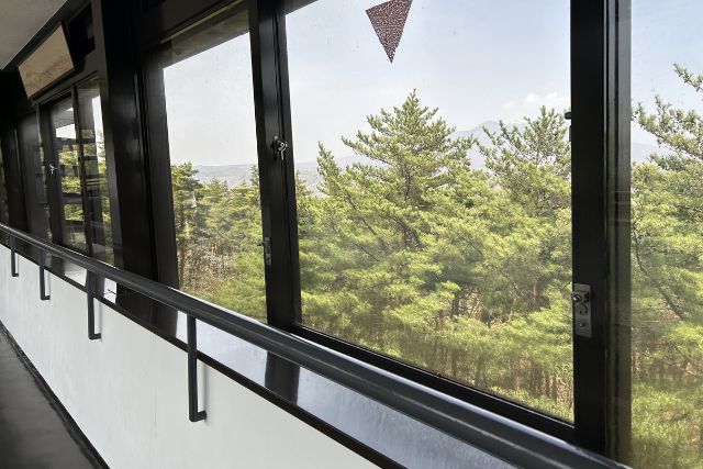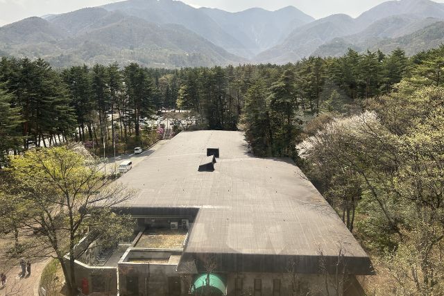 「ウイスキー博物館」の屋根と屋根を繋ぐようにある渡り廊下からは山々や白州蒸溜所内を見ることができました!